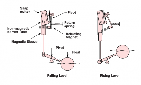 La fuerza de flotación del líquido de proceso en un flotador provocan que se mueve con la superficie del líquido. El movimiento del flotador gira un magneto dentro del campo de un magneto interruptor de carga similar. Según los magnetos se repelan uno al otro, el interruptor magneto se mueve, actuando al interruptor.